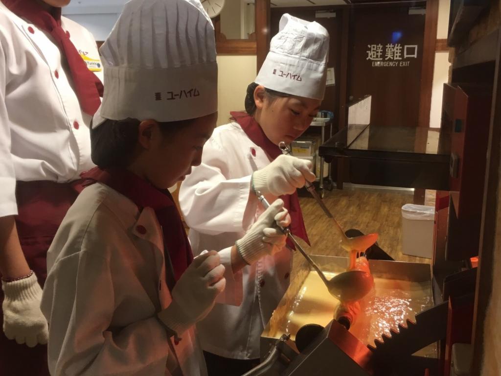 こちらはお菓子屋さんで、バウムクーヘンを作っているところ。作ったものは実際に持って帰ることができて大変人気なショップです。