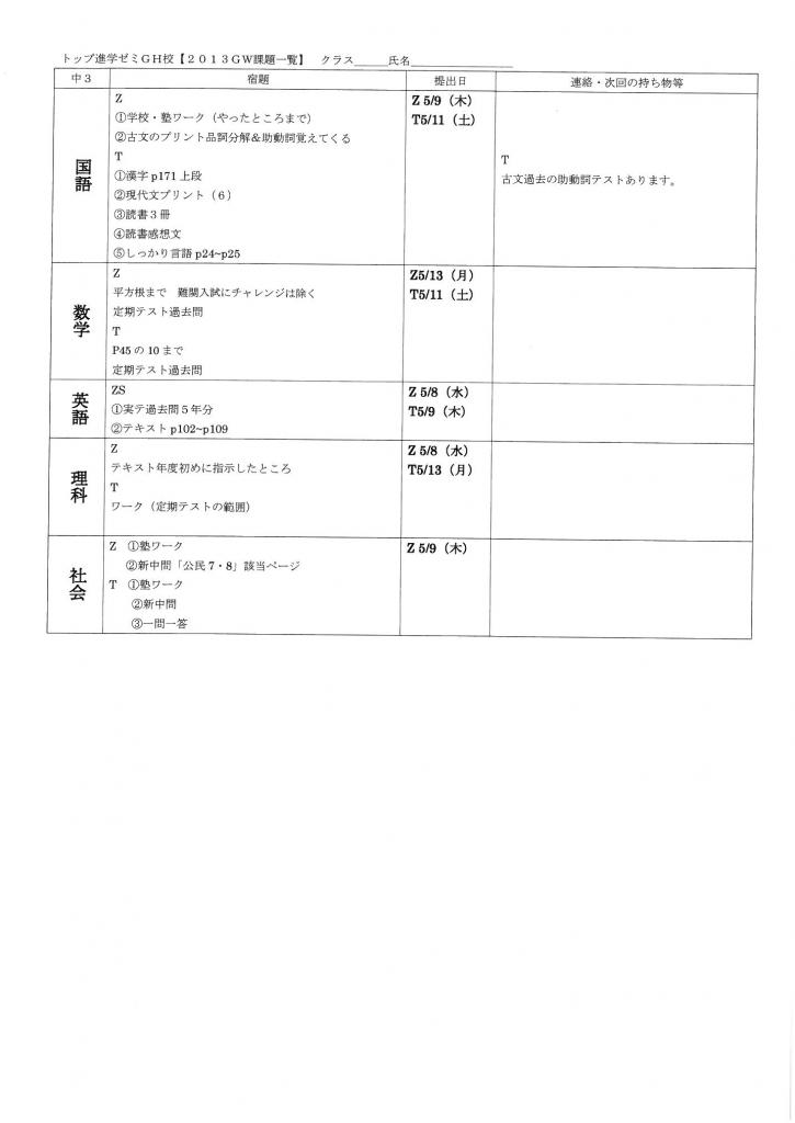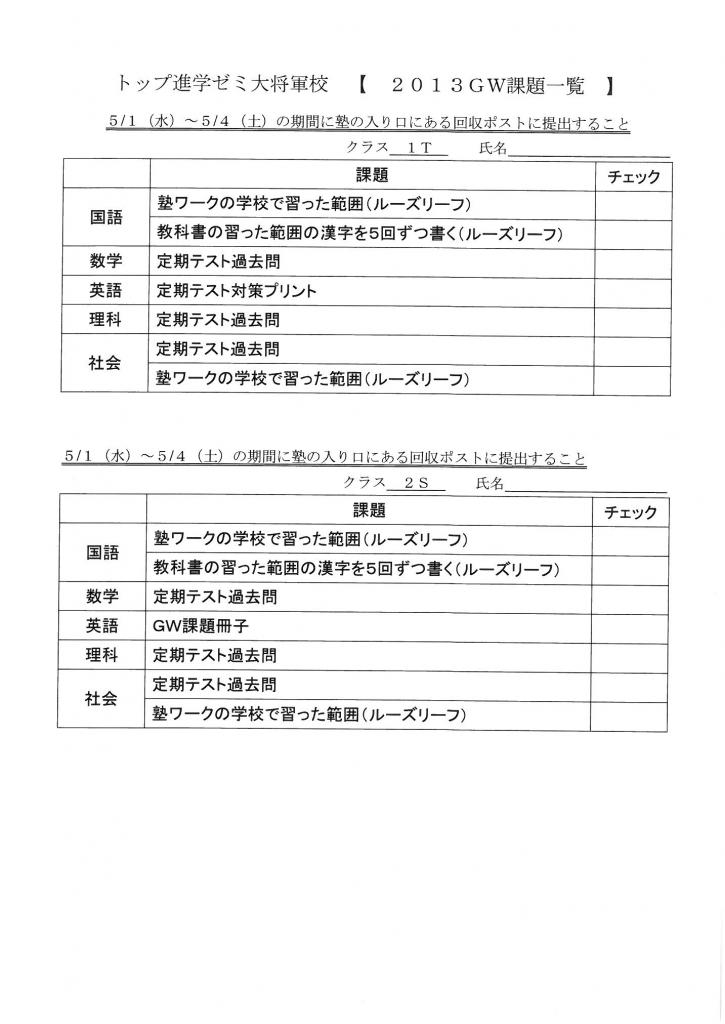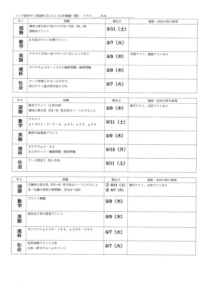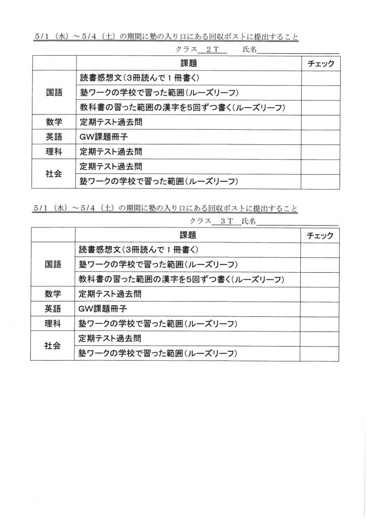 生徒達には渡してありますが、「もう終わったー」とか「宿題でてへんもん」なんていう言い逃れを防ぐためにもここに一覧をアップしておきます。