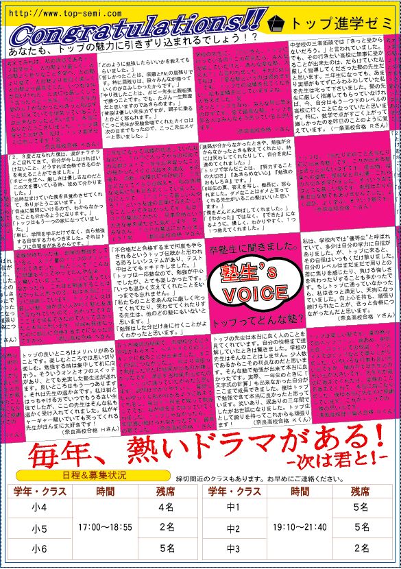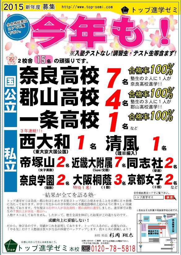 こちらも12人中、奈良高校合格者が5人、郡山高校合格者が3人と、菜畑校史上最高の結果を残してくれました。