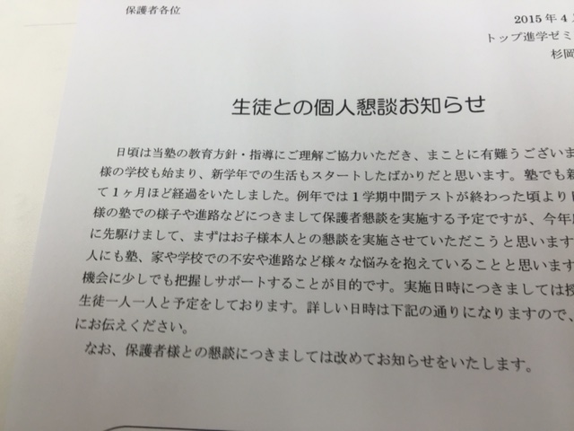 保護者懇談は例年5月末ぐらいから行うのですが、それに先駆けて、生徒との懇談を行いたいと思います。